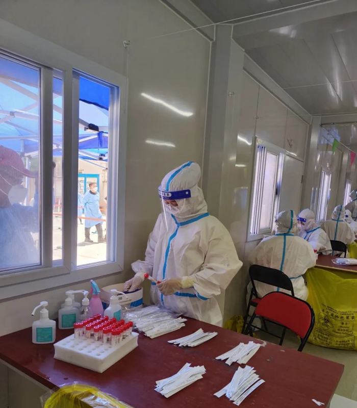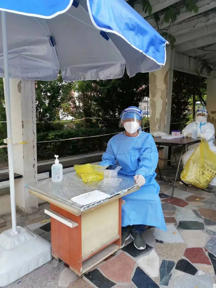 隨著天氣愈發(fā)的燥熱,換上大白的我們,衣服瞬間就已經(jīng)濕透了,但大家沒(méi)有一句怨言,繼續(xù)戰(zhàn)斗在檢測(cè)一線。有的時(shí)候做核酸的居民太多,我們的醫(yī)護(hù)人員和志愿者不能按時(shí)吃飯,好在小區(qū)的群眾都很配合,一句句“謝謝,辛苦了”沁入心脾,真的很感動(dòng)。