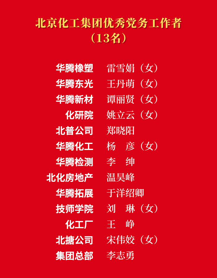 為熱烈慶祝中國共產黨成立103周年,大力表彰在推進“十四五”規劃、推動集團“231”戰略布局、完成重點工作任務等各方面涌現出來的先進集體和先進個人,市國資委黨委決定,授予北搪黨委“先進基層黨組織”稱號,授予技師學院姜洪強“優秀共產黨員”稱號,授予北京化工集團總部李志勇“優秀黨務工作者”稱號;北京化工集團黨委決定,授予14個黨支部“先進基層黨支部”稱號,授予29名同志“優秀共產黨員”稱號,授予13名同志“優秀黨務工作者”稱號。