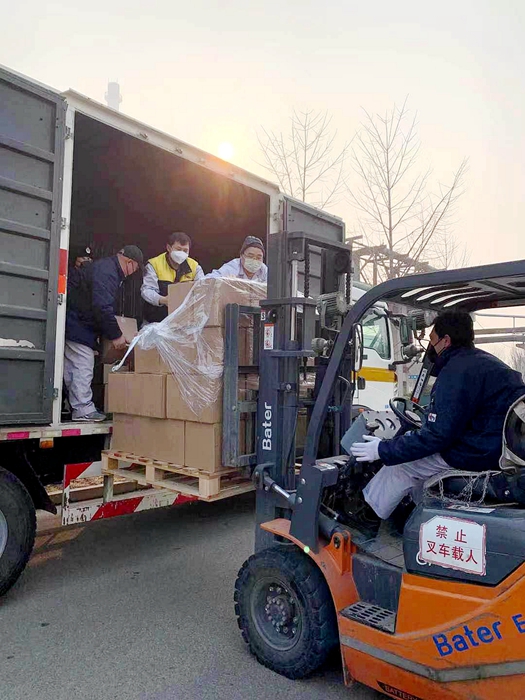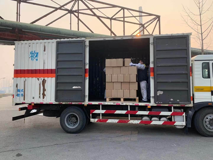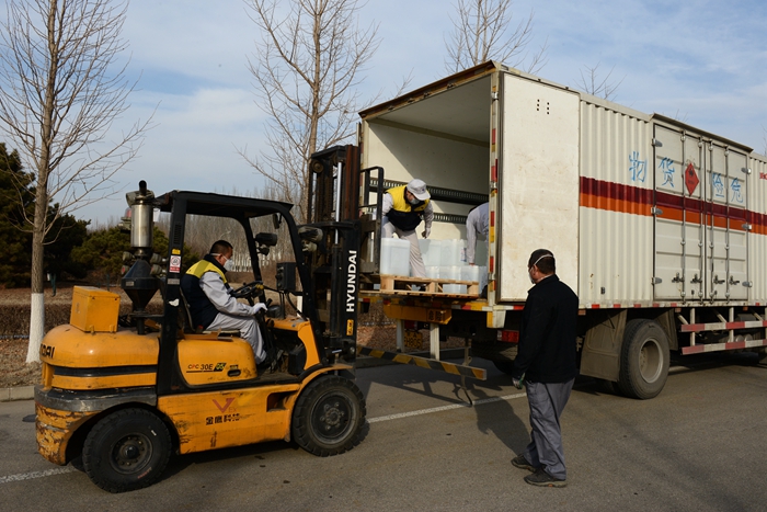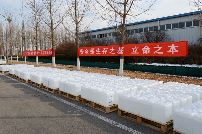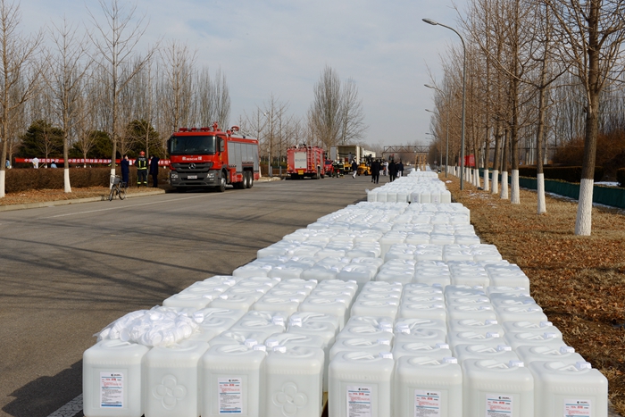 根據(jù)用戶反饋的需求信息,經(jīng)市物資保障組決定,將25L大包裝調(diào)整為500ML/瓶小包裝,北化集團承擔相關(guān)卸貨、進庫、儲存、配送任務。由華騰化工公司倉儲事業(yè)部、安全生產(chǎn)部、保衛(wèi)部、公用工程事業(yè)部20名同志負責卸貨入庫。